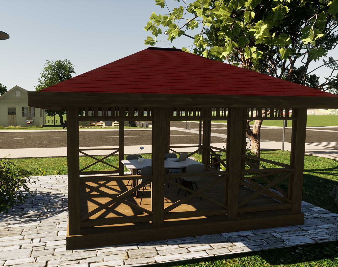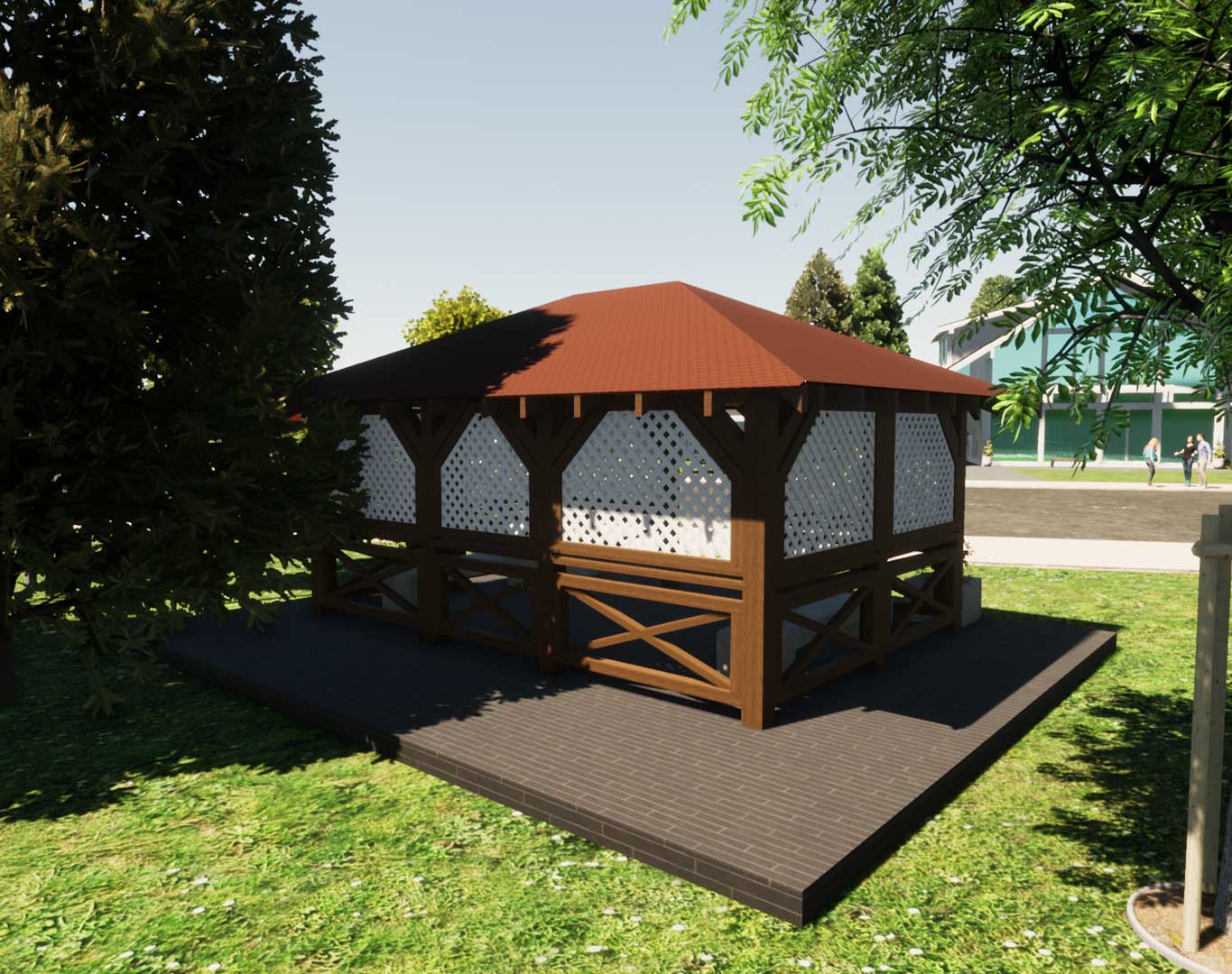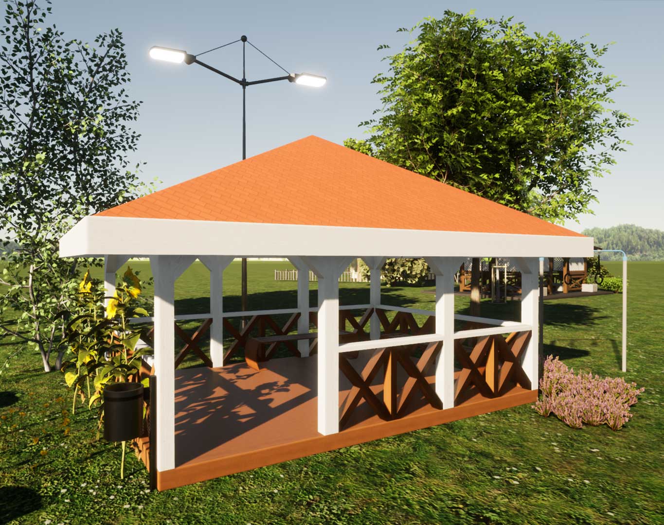 Беседка изготавливается в производственных условиях из клееного бруса по сертифицированной технологии. Приобретение готовой беседки позволяет избежать затяжного процесса строительства.